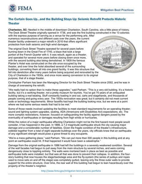 The Dock Street Theatre in Charleston, SC underwent a major retrofit in 2010 to protect it from seismic and high wind damages. The retrofit included updating facilities to meet standard requirements for an operating theater, focusing on safeguarding the facility against earthquakes, high winds, and hurricanes. The renovation involved buttressing and reinforcing walls with steel and concrete, securing large metal pipes, rebuilding columns, and securing HVAC equipment. The project, costing over $20 million, was funded through federal grants, city funds, and fundraising efforts, including a grant from the National Park Service.
