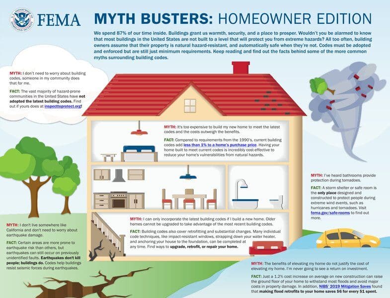 The resource debunks myths related to building codes and natural hazard resistance for homeowners. It emphasizes the importance of adopting and enforcing building codes to protect properties from extreme hazards, such as earthquakes, floods, and hurricanes. The document aims to raise awareness among homeowners about the cost-effective benefits of meeting current building codes to mitigate vulnerabilities and reduce property damage from natural disasters.