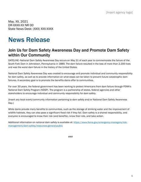 The news release announces the observance of National Dam Safety Awareness Day on May 31 of each year to remember the South Fork Dam failure in 1889, emphasizing individual and community responsibility, and highlighting the significance of dams to communities alongside flood risks. It mentions FEMA's National Dam Safety Program as a 30-year effort to prevent dam failures and promote safety.