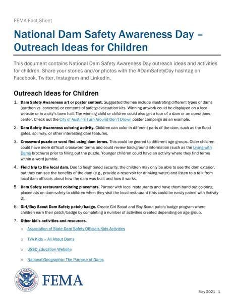 The document provides outreach ideas and activities for children related to National Dam Safety Awareness Day. It includes suggestions like art contests, coloring activities, crossword puzzles, field trips, restaurant coloring placemats, and scout badge programs. The aim is to raise awareness among children about dam safety and engage them in educational and fun activities.