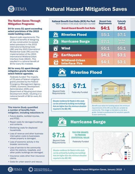 The resource discusses the benefits of exceeding select provisions in the 2015 International Building Code (IBC), International Residential Code (IRC), and International Wildland-Urban Interface Code (IWUIC) in terms of natural hazard mitigation. It highlights the cost-effectiveness of investing in mitigation programs by quantifying benefits such as reductions in future deaths, injuries, property damage, and economic losses associated with disasters. The document also presents benefit-cost ratios for various natural hazards like riverine floods, hurricane surges, wind events, earthquakes, and wildland-urban interface fires.