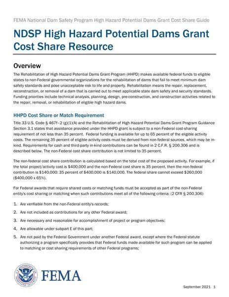 The NDSP High Hazard Potential Dams Grant Cost Share Resource provides guidance on the cost-sharing requirements for the Rehabilitation of High Hazard Potential Dams Grant Program. This program offers federal funds to eligible states and non-Federal governmental organizations for the rehabilitation of dams that do not meet safety standards and pose risks to life and property. The document outlines the federal and non-federal cost-sharing requirements, eligibility criteria, and necessary documentation for cost-sharing contributions.