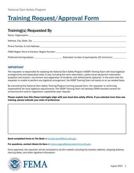 The NDSP Training Request Approval Form is used to request and approve training sessions under the National Dam Safety Program. It outlines the responsibilities of the requester, including logistical arrangements and associated costs. The form also lists available training courses, their delivery types, and durations.