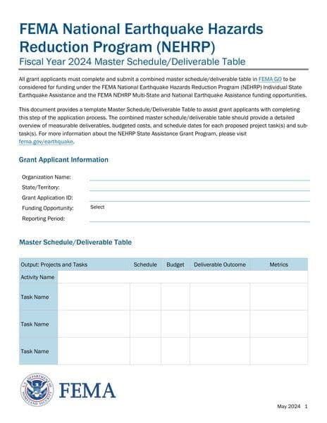 The document provides information on the FEMA National Earthquake Hazards Reduction Program (NEHRP) for the fiscal year 2024. It outlines the requirement for grant applicants to submit a combined master schedule/deliverable table through FEMA GO to be eligible for funding under the program. The master schedule/deliverable table should detail measurable deliverables, budgeted costs, and schedule dates for proposed project tasks and sub-tasks. The document also offers a template to help applicants in completing this step of the application process.