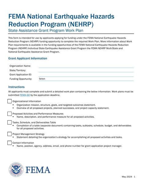 The NEHRP State Earthquake Assistance Grant Program Work Plan is a comprehensive guide for applicants seeking funding under FEMA's National Earthquake Hazards Reduction Program. It details the requirements for the Work Plan, including organizational information, proposed activities, tasks, schedule, deliverables, project management strategy, and contact information.