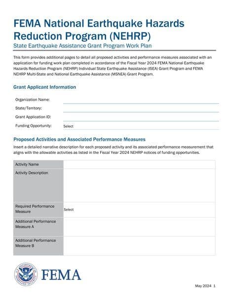The document outlines the FEMA National Earthquake Hazards Reduction Program (NEHRP) State Earthquake Assistance Grant Program Work Plan for the Fiscal Year 2024. It provides details on proposed activities, performance measures, grant applicant information, and aligning activities with the funding opportunities for earthquake assistance grants.