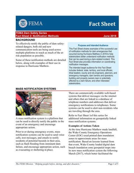 The FEMA Dam Safety Series Fact Sheet 2 focuses on notification methods for dam-related incidents, particularly showcasing examples during Hurricane Matthew. It discusses the use of mass notification systems, press releases, social media, in-person notifications, flyers, and coordinated messaging to effectively inform the public and stakeholders about dam safety issues, encourage appropriate actions, and coordinate responses. The document emphasizes the importance of a well-coordinated, layered approach to notification to ensure messages reach all affected parties.