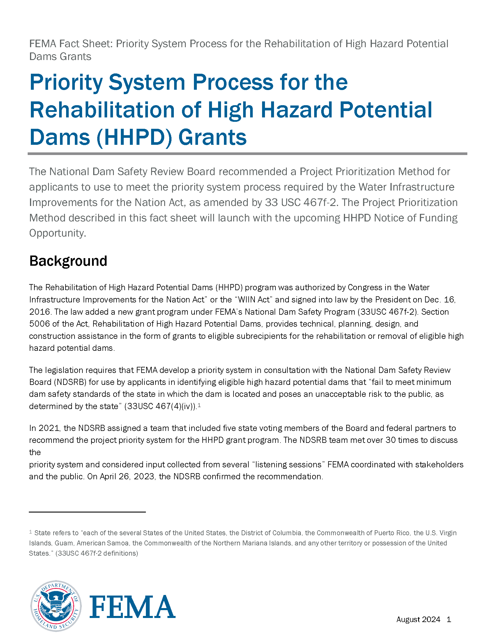 The National Dam Safety Review Board recommended a Project Prioritization Method for applicants to use to meet the priority system process required by the Water Infrastructure Improvements for the Nation Act, as amended by 33 USC 467f-2. The Project Prioritization Method described in this fact sheet will launch with the upcoming HHPD Notice of Funding Opportunity.