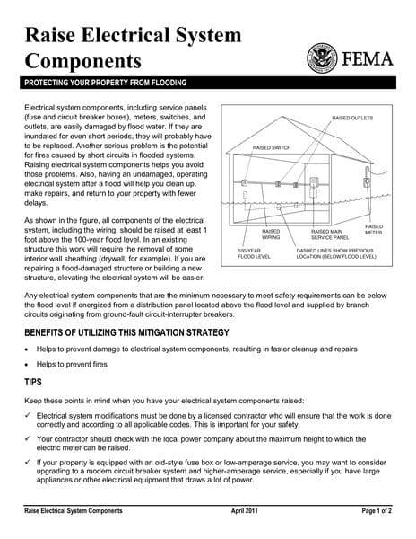 This resource provides guidance on raising electrical system components to protect properties from flooding. It details the benefits of elevating electrical systems, such as preventing damage and fires, and offers tips for implementation. The document also includes cost estimates and references additional FEMA resources for further information.