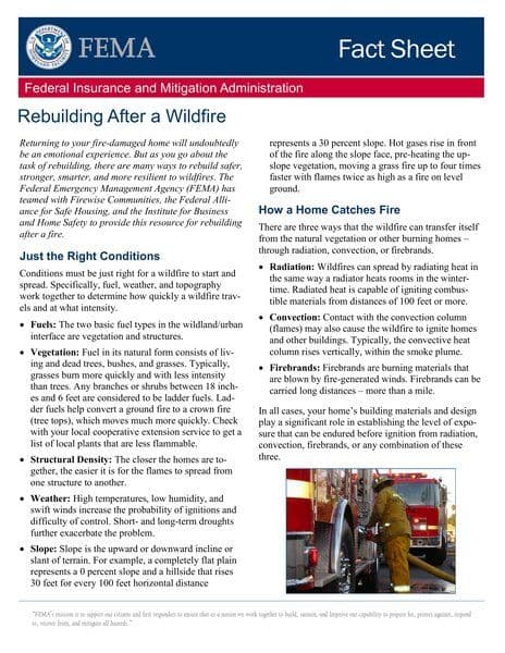 The resource by the Federal Insurance and Mitigation Administration provides guidance on rebuilding homes after a wildfire to make them safer, stronger, smarter, and more resilient to wildfires. It explains the conditions necessary for wildfires to start and spread, the importance of a survivable space around the home, fire-resistant building materials, and maintenance of the space. The resource also highlights the vulnerability of homes to different aspects of wildfires such as radiation, convection, and firebrands. Additionally, it addresses the increased risks of floods and mudslides following a wildfire and provides mitigation strategies to prevent flood damage in wildfire-impacted areas.