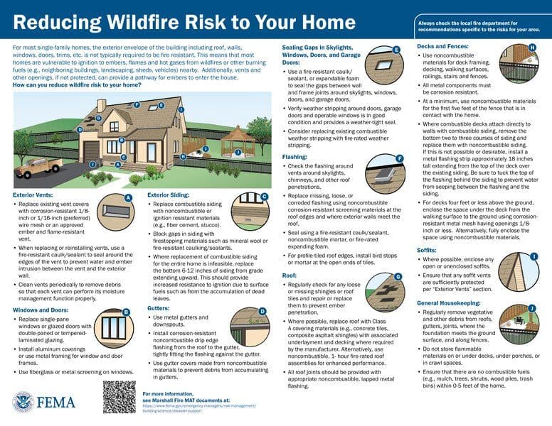 The resource provides detailed guidance on reducing wildfire risk to homes. It emphasizes the vulnerability of most single-family homes to ignition from embers, flames, and hot gases during wildfires. The document recommends various protective measures for different components of a home, such as exterior vents, siding, windows, doors, gutters, skylights, roofs, decks, fences, and soffits. It stresses the importance of using noncombustible materials, corrosion-resistant components, and fire-resistant sealants to enhance the fire resistance of the building.