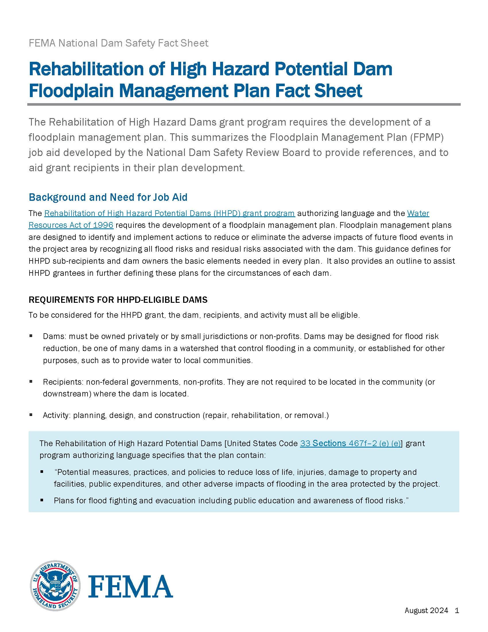 The Rehabilitation of High Hazard Dams grant program requires the development of a floodplain management plan. This summarizes the Floodplain Management Plan (FPMP) job aid developed by the National Dam Safety Review Board to provide references, and to aid grant recipients in their plan development.