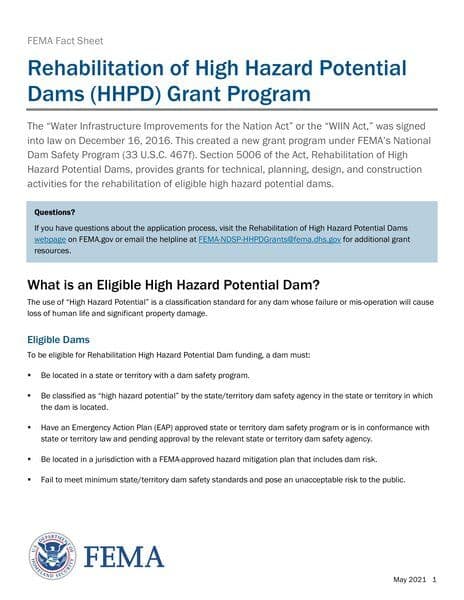 The FEMA Fact Sheet provides comprehensive information about the Rehabilitation of High Hazard Potential Dams (HHPD) Grant Program, established under FEMA's National Dam Safety Program. It details eligibility criteria for high hazard potential dams seeking funding for rehabilitation, lists eligible and ineligible activities, outlines applicant requirements, fund allocation, and additional resources for further information.