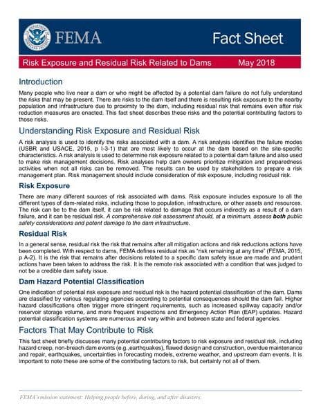 The resource provides comprehensive information on risk exposure and residual risk related to dams. It covers understanding risk exposure, residual risk, contributing factors to risk, hazard potential classification, and factors that may contribute to risk. Topics include hazard creep, non-breach dam events, large reservoir releases, controlled or partial breaches, dam design, construction, and repair, state regulatory requirements, uncertainties in inundation and forecasting models, and conditions beyond the dam. The document emphasizes the importance of identifying and mitigating risks associated with dams to protect nearby populations, infrastructure, and surrounding assets.
