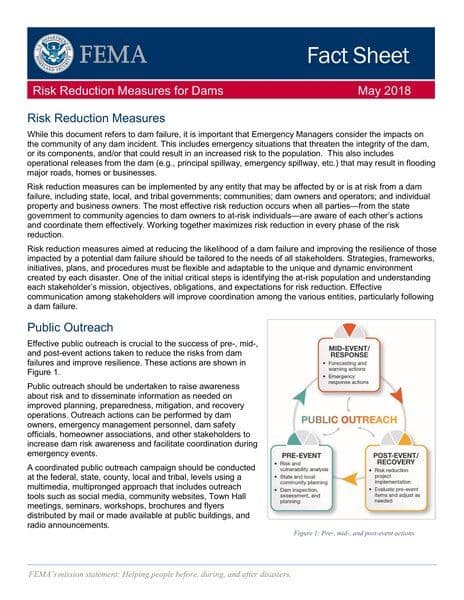 The resource discusses risk reduction measures for dams, emphasizing the importance of evaluating potential impacts on the community of any dam incident. It highlights the need for effective risk reduction involving various stakeholders such as governments, dam owners, and individual property owners. The document provides guidance on assessing risks, preparing for emergencies, public outreach, mitigation strategies, and planning activities at different jurisdictional levels. It also covers the importance of pre-event planning, consequence assessment, emergency response planning, operations and maintenance, training, and recovery efforts following a dam failure.