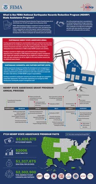 The resource provides information about the FEMA National Earthquake Hazards Reduction Program (NEHRP) State Assistance Program, which aims to enhance earthquake risk reduction activities at the local, state, and national levels. It explains the funding opportunities available through EARTHQUAKE DIRECT STATE ASSISTANCE (EDSA) for states and territories with moderate to high earthquake risk, as well as EARTHQUAKE CONSORTIA AND PARTNER SUPPORT (ECPS) to support multi-state projects. The document also outlines the NEHRP STATE ASSISTANCE GRANT PROGRAM's annual process, including timelines and funding facts for FY19.