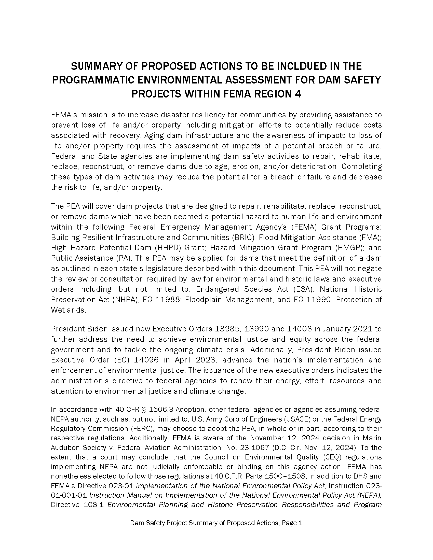 The Programmatic Environmental Assessment (PEA) covers dam projects aimed at repairing, rehabilitating, replacing, reconstructing, or removing dams deemed hazardous to human life and the environment. These projects are part of FEMA's Grant Programs, including BRIC, FMA, HHPD, HMGP, and PA. The PEA ensures compliance with environmental and historic laws and executive orders, such as the ESA, NHPA, EO 11988, and EO 11990. It also aligns with recent executive orders on environmental justice and climate change.