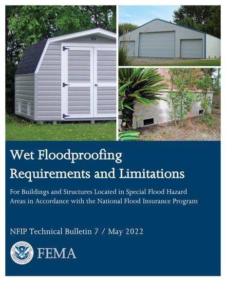 The resource provides detailed guidelines and requirements for wet floodproofing of buildings, including considerations for different types of structures and components such as enclosures below elevated buildings, garages, and accessory structures. It covers authorization for wet floodproofing, community modifications to floodplain management regulations, and implications for NFIP Community Rating System communities approving wet floodproofing. The document also includes retrofit measures for existing buildings that are not required to comply with NFIP standards, suggestions for best practices, and guidance on protection of mechanical, plumbing, electrical systems, and fuel storage tanks.