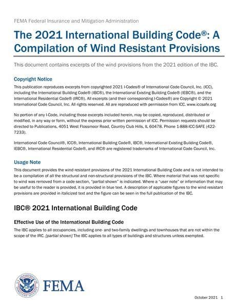 The resource is a compilation of wind-resistant provisions from the 2021 International Building Code. It covers aspects such as wind-resistant provisions, structural design, materials, and installation requirements for exterior walls, windows, doors, and different types of sidings, including vinyl, fiber-cement, polypropylene, and metal composite materials (MCM). The document emphasizes the importance of weather protection, load resistance, fastening protocols, and compliance with specific standards and testing criteria. It also details the requirements for storm shelters within buildings and critical emergency operations sites in hurricane and tornado-prone regions.