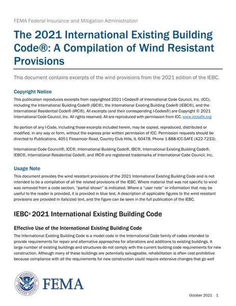 The resource focuses on wind-resistant provisions outlined in the 2021 International Existing Building Code®. It provides guidelines for retrofitting existing structures to enhance their resistance to wind loads. The document covers topics such as retrofit stud splices, connection methods between horizontal braces and retrofit studs, gable end wall connections, roof deck fastening for high-wind areas, and roof deck attachment for wood roofs.