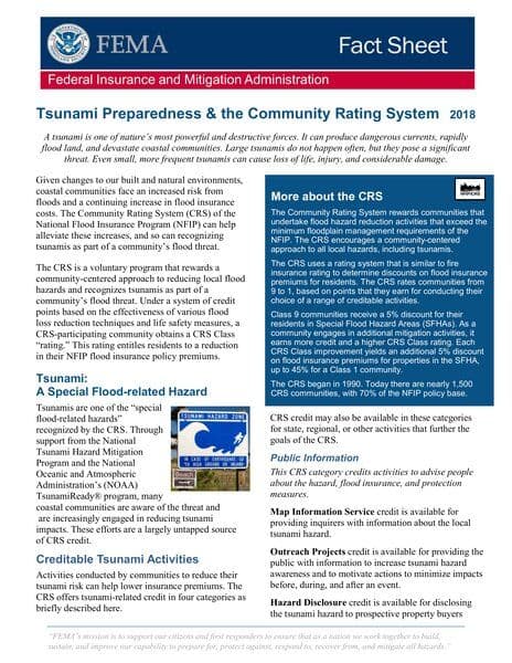 The resource focuses on tsunami preparedness and the Community Rating System (CRS) as part of the National Flood Insurance Program (NFIP). It emphasizes the importance of reducing local flood hazards, including tsunamis, in coastal communities. The CRS offers incentives for communities to undertake activities that mitigate flood-related risks, such as providing public information, mapping hazard areas, implementing higher regulatory standards, reducing flood damage to existing development, and coordinating warning and response efforts before, during, and after an event. By participating in the CRS and improving their CRS Class rating, communities can receive discounts on flood insurance premiums, ultimately leading to better preparedness for tsunamis and enhanced safety measures for residents.