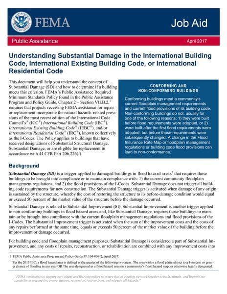 This document provides a comprehensive understanding of Substantial Damage (SD) as it pertains to the International Building Code, International Existing Building Code, and International Residential Code. It details the criteria for determining Substantial Damage, the financial thresholds involved, and the necessary compliance with floodplain management regulations and I-Codes. Additionally, it outlines the repair or replacement funding options available under FEMA's Public Assistance Program.