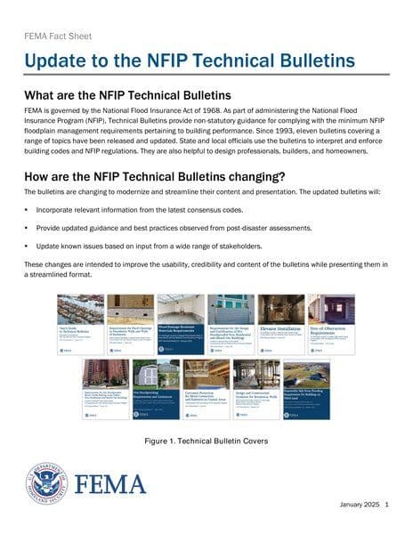 The FEMA resource provides an update on the NFIP Technical Bulletins which offer guidance for complying with the requirements of the National Flood Insurance Program regarding building performance in floodplain management. The bulletins are being modernized to incorporate information from the latest consensus codes, best practices from post-disaster assessments, and input from stakeholders. They cover a range of topics such as requirements for flood openings, flood damage-resistant materials, elevator installation, and more, aimed at various audiences including state and local officials, design professionals, builders, and homeowners.