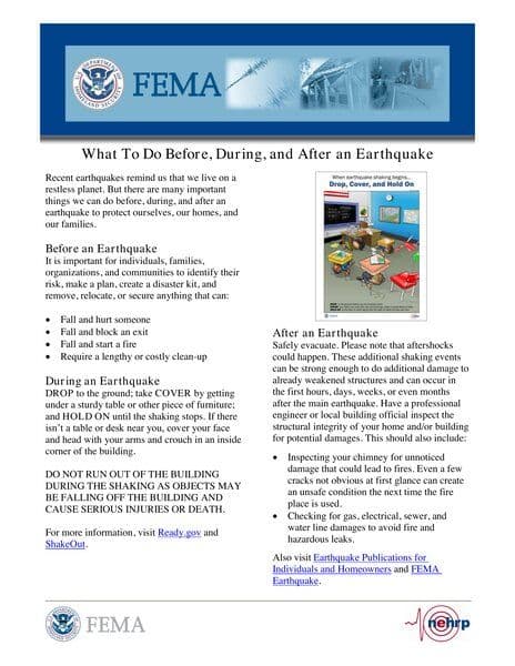 The resource provides detailed guidance on what individuals, families, organizations, and communities can do before, during, and after an earthquake to protect themselves, their homes, and their families. It emphasizes the importance of identifying risks, making a plan, creating a disaster kit, and securing items that can cause harm or start fires. The document also includes specific instructions on actions to take during an earthquake, such as dropping to the ground, taking cover under sturdy furniture, and holding on until the shaking stops. Additionally, it highlights the importance of not running outside during shaking and the need to evacuate safely after an earthquake, considering the potential risks of aftershocks and the importance of inspecting buildings for damages.