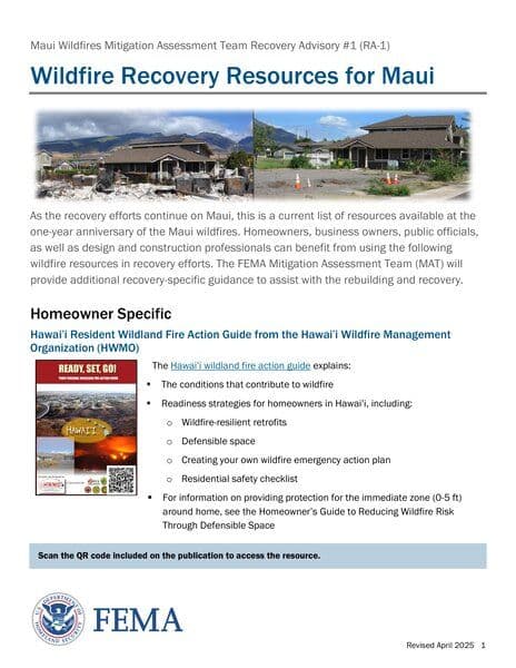 The Maui Wildfires Mitigation Assessment Team Recovery Advisory #1 offers comprehensive resources for various stakeholders in Maui to mitigate and recover from wildfires. It includes guidance on wildfire-resilient retrofits, defensible space, reducing structure ignition risks, and public facility hazard mitigation. The advisory also provides technical advisories on multi-hazard mitigation strategies, wildfire-resilient subdivision planning, and decreasing structure-to-structure fire spread. Additionally, it covers wildfire protection plans, building codes and standards, and resources for recovery assistance and home preparedness.