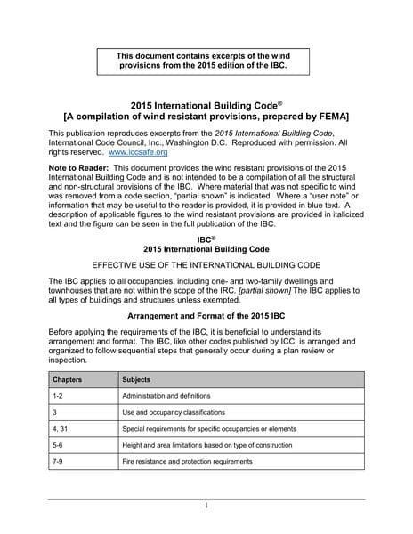 The document contains excerpts from the 2015 edition of the International Building Code, focusing on wind resistant provisions. It explains the application and arrangement of the IBC, definitions, requirements for different building systems, and guidelines for structural design, including wind loads, roof assemblies, and rooftop structures. The text also describes specific standards and procedures for materials like vinyl siding, metal composite materials, and exterior insulation systems. It outlines mitigation measures for storms through the construction of storm shelters in accordance with ICC 500.