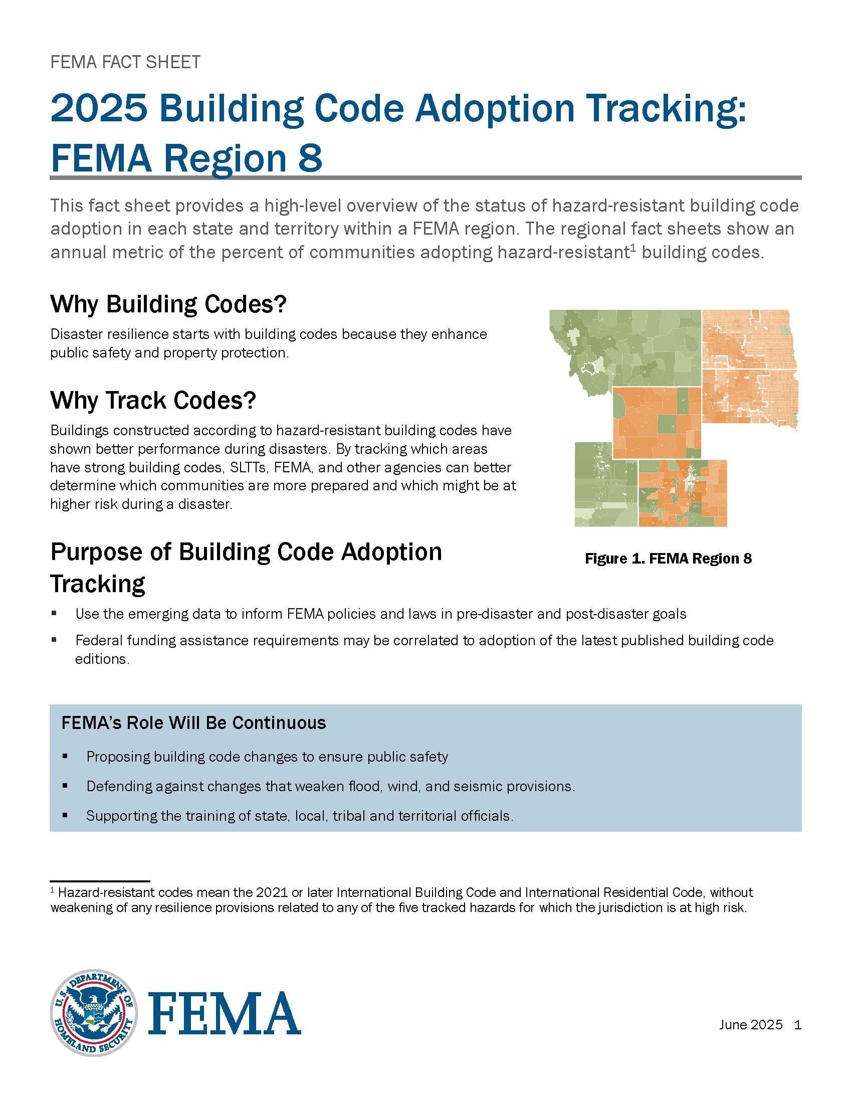This fact sheet provides a high-level overview of the status of hazard-resistant building code adoption in each state and territory within FEMA Region 8. It includes an annual metric of the percent of communities adopting hazard-resistant building codes.