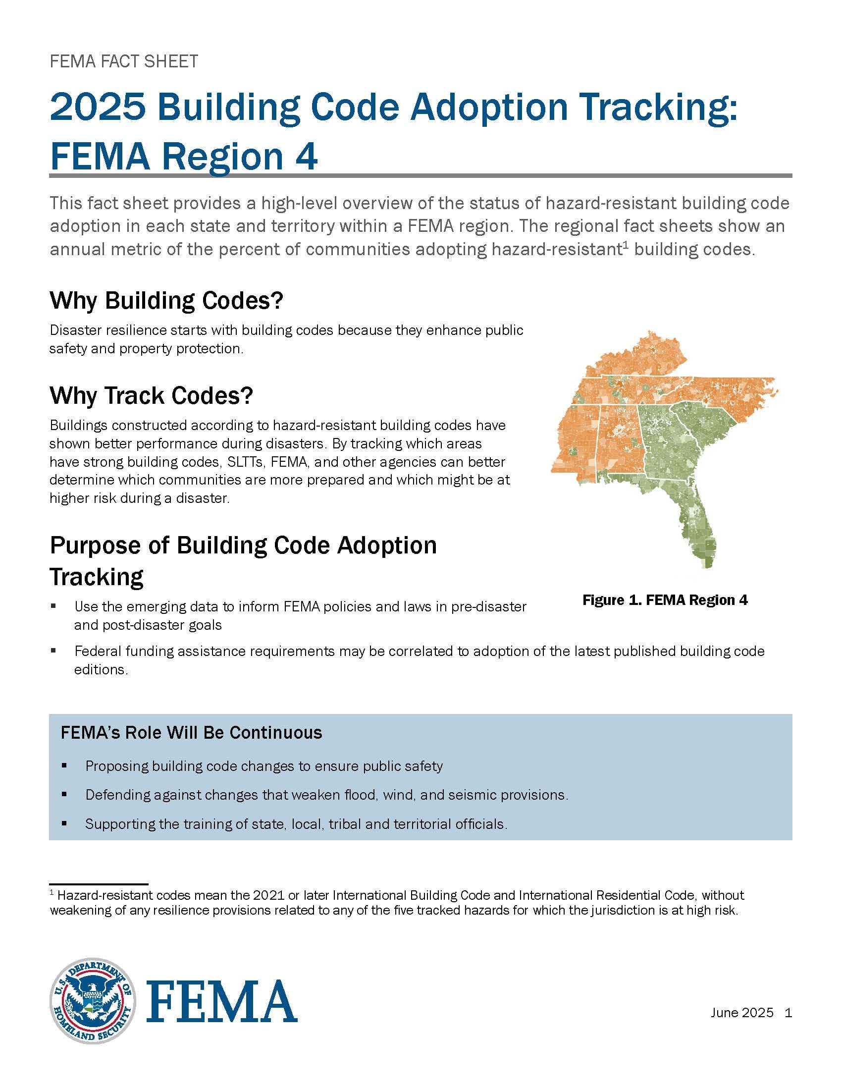 This fact sheet provides a high-level overview of the status of hazard-resistant building code adoption in each state and territory within FEMA Region 4. It includes an annual metric of the percentage of communities adopting hazard-resistant building codes.