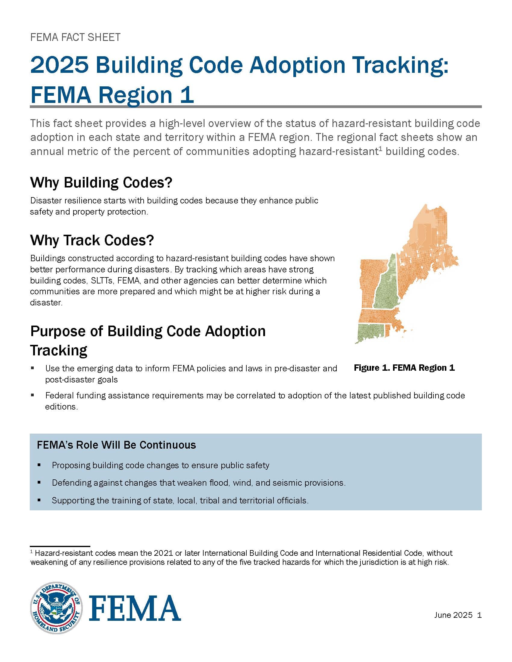 This fact sheet provides a high-level overview of the status of hazard-resistant building code adoption in each state and territory within FEMA Region 1. It includes an annual metric of the percent of communities adopting hazard-resistant building codes.